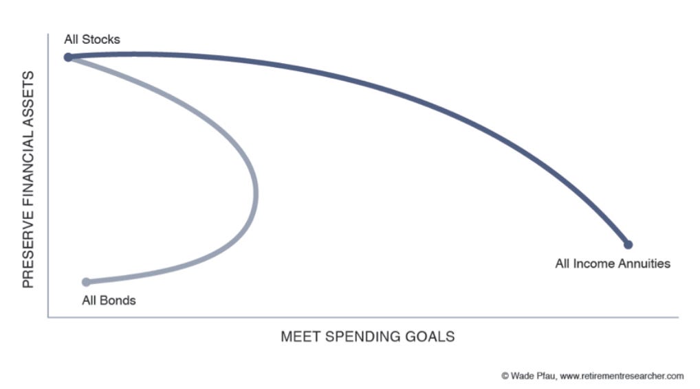 Pfau argues that there exists - analogous to the 1950s Markowitz Modern Portfolio Theory about diversifying portfolio assets - an ‘efficient frontier’ in retirement products. According to Pfau’s own analysis, that efficient frontier includes stocks in a brokerage account plus guaranteed income annuities. But, pointedly, not bonds.